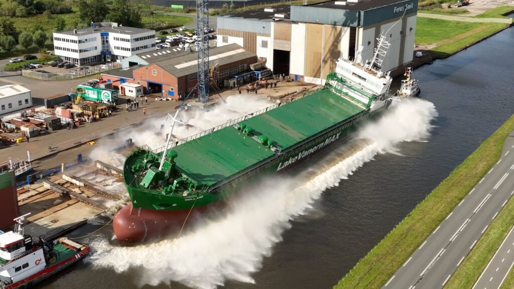 The launch marked the vessel built in Europe in close partnership with Ferus Smit – a collaboration that has shaped Northern European shipping for generations. Kolland is also the fifth of six vessels in the Lake Vänern Max series, specially designed to maximize cargo efficiency on shallow waters while minimizing environmental impact.